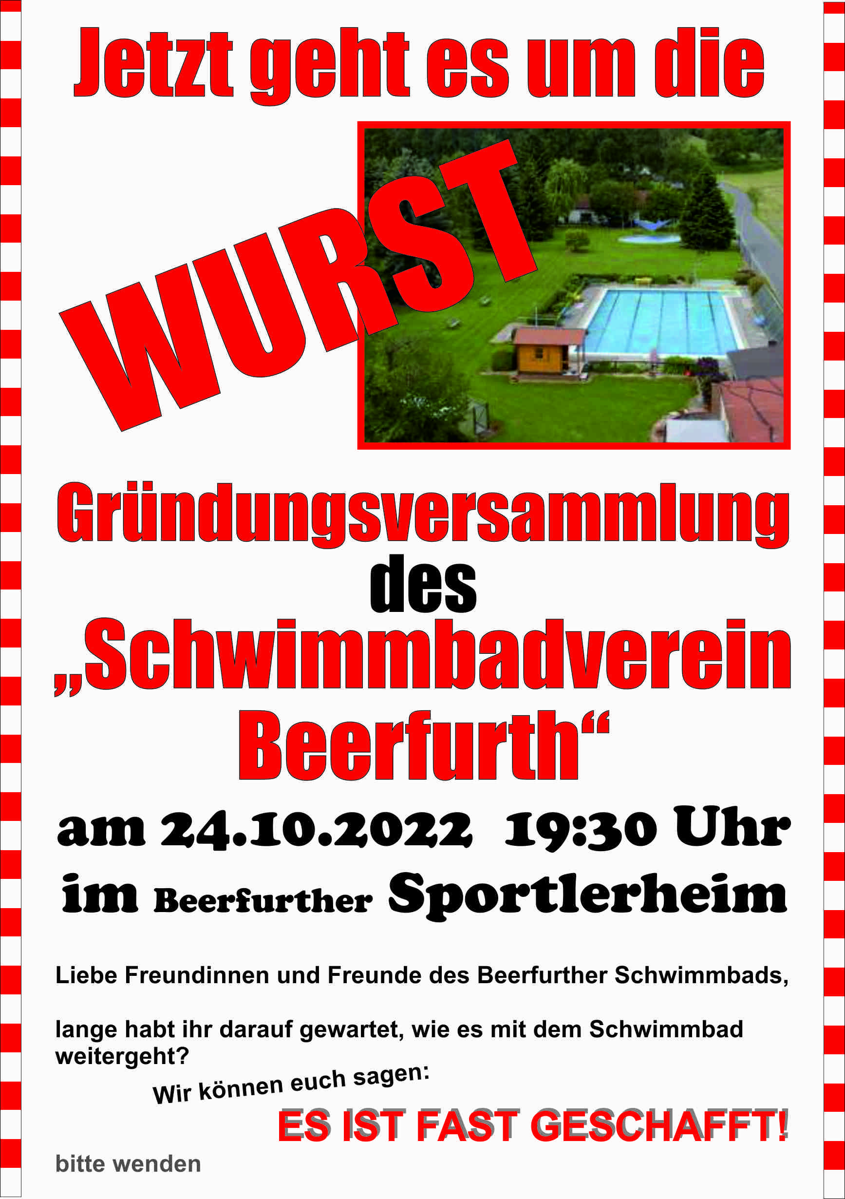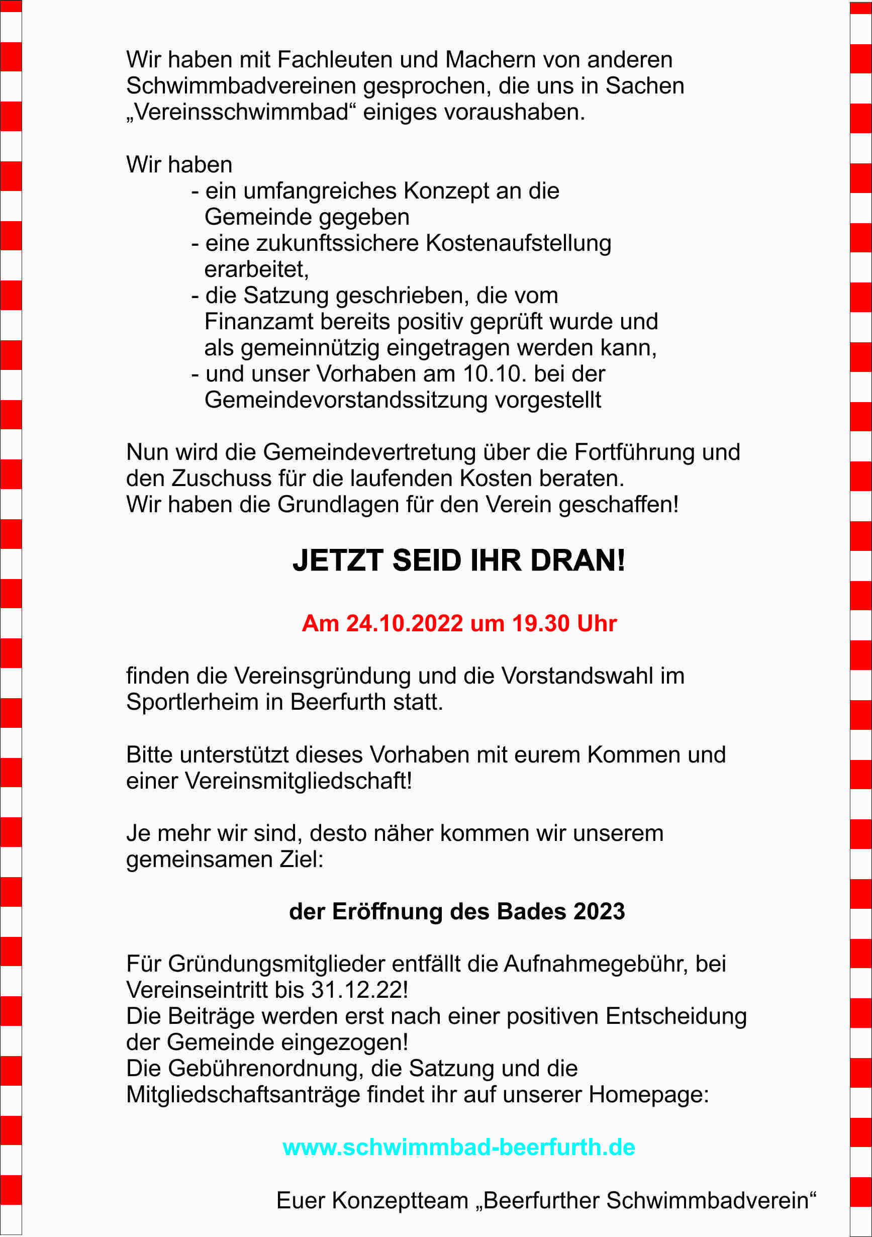 Daher noch einmal die Bitte an euch: Macht weiter bei euren Freunden, Nachbarn, Verwandten und Bekannten Werbung für unseren Verein und unser Bad. Jedes weitere Mitglied bringt uns unserem Ziel ein Stück näher.